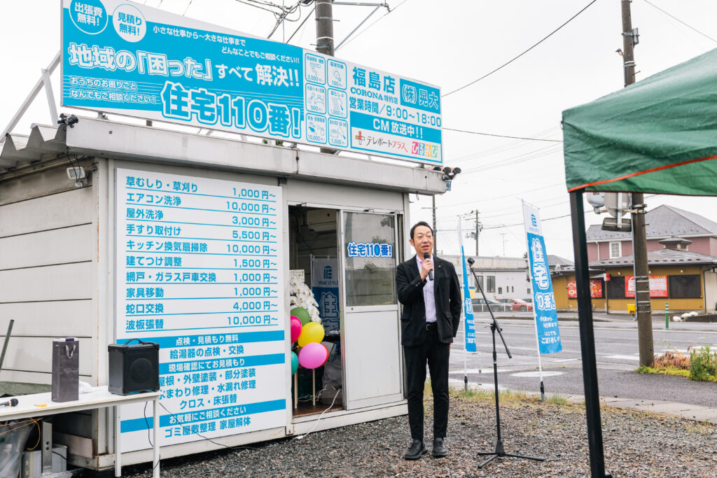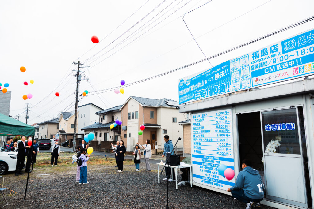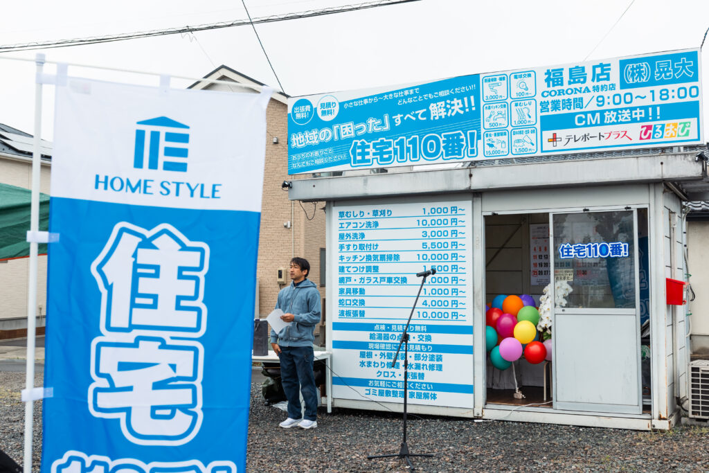 令和7年5月25日 弊社が運営する「住宅110番!福島店」がオープンしました。株式会社ホームスタイルさんの運営する「住宅110番!」で学んだ経験を糧に、フランチャイズ店として「福島県内のお困りごとを解決の為に日々尽力をしていきたい!」と誓い、準備を進めてきました。オープンに際し、株式会社ホームスタイルの原社長はじめ多くの皆様にご来店賜り、激励を賜りましたことに心より感謝を申し上げます。オープン直後より、多くのお問い合わせをいただくこととなりました。ありがとうございました。住宅110番!では暮らしのお困りごとに関して小さなことから大きなことまでなんでもご相談に応じますので,まずはお電話で! 0120-844-177 御気軽にご相談ください。スタッフ一同、誠心誠意解決に向けて頑張らせていただきます!